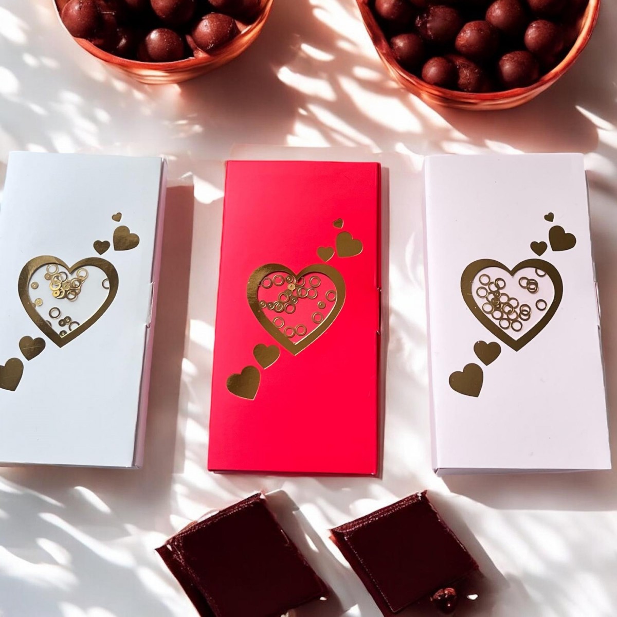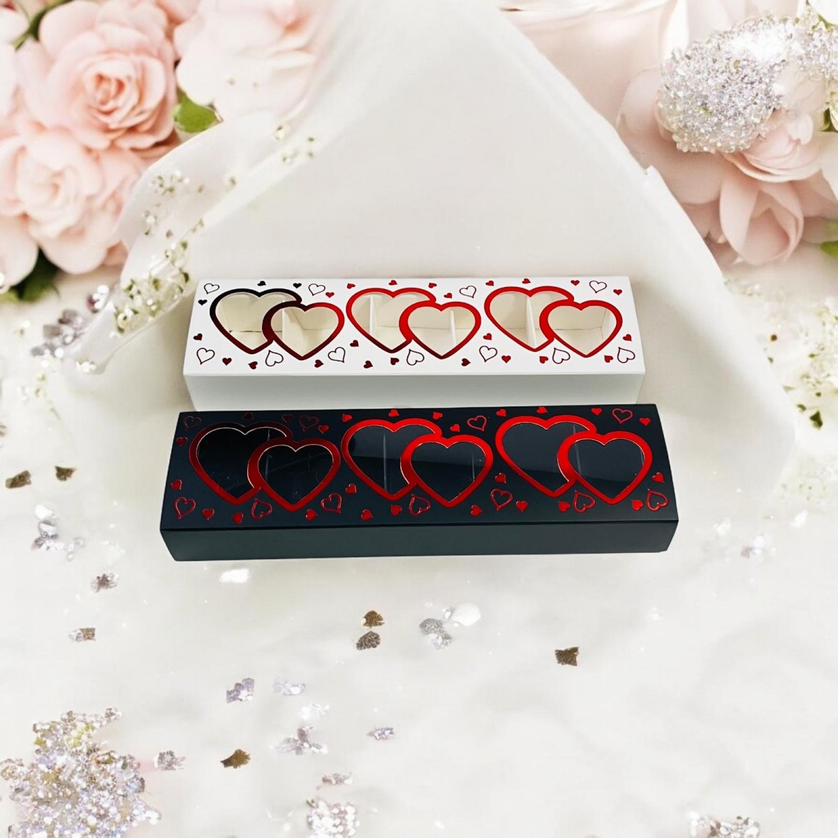 5 Bölmeli İkili Kalp Tasarım Kırmızı Yaldızlı Çikolata Kutusu